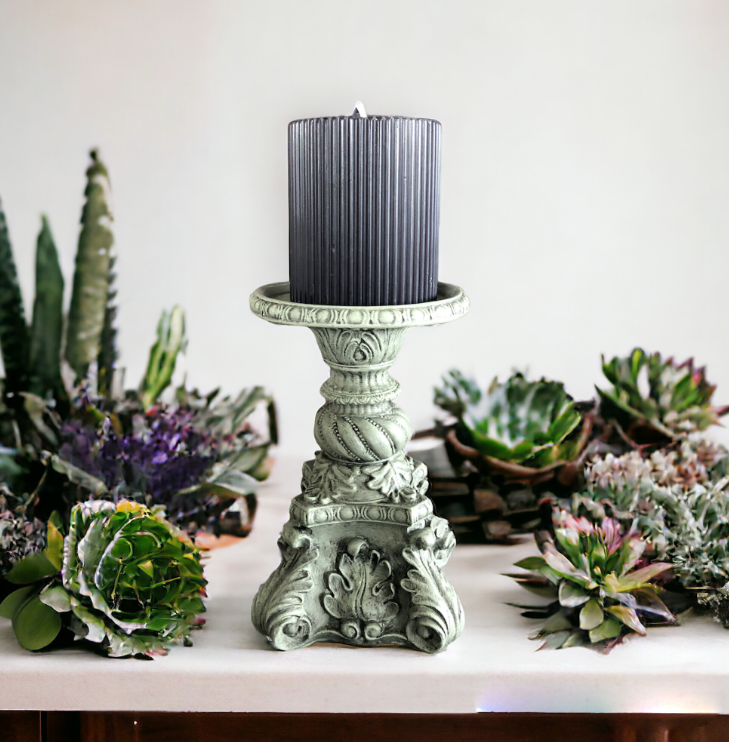 Ajoutez une note d’élégance intemporelle à votre intérieur avec ce bougeoir patiné à la main, où la finesse du vert-de-gris rencontre la profondeur d’un noir subtilement travaillé.